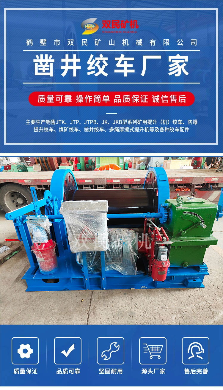鶴壁市雙民礦山機(jī)械有限公司是鑿井絞車廠家,以制造大型礦山提升設(shè)備,電器成套自動化控制系統(tǒng)為主的科研型高科技企業(yè),是國家礦山專用設(shè)備及配件產(chǎn)品定點生產(chǎn)單位。主要生產(chǎn)、銷售JTK、JTP、JTPB、JK、JKB、JKM、JKMD型系列礦用提升絞車、礦井提升機(jī)、多繩摩擦式提升機(jī)、JZ型鑿井絞車及礦山各種成套設(shè)備及配件。
