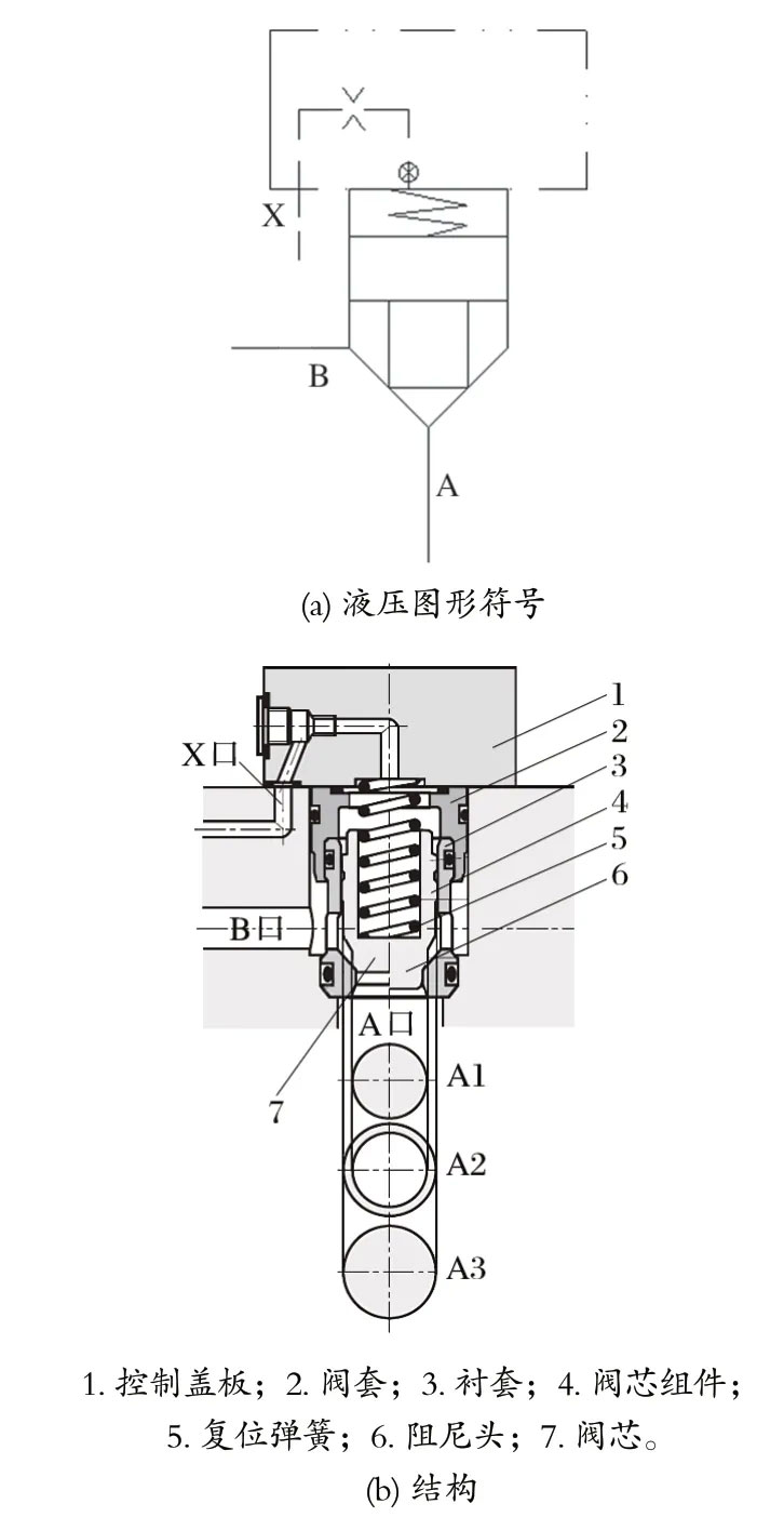 3.1 二通插裝閥 二通插裝閥由插裝組件、控制蓋板等組成。插裝組件安裝于油路塊中符合 ISO 7368 的標(biāo)準(zhǔn)安裝孔中,并用控制蓋板封嚴(yán)。通過插裝組件,控制蓋板和其他附件的組合可以實(shí)現(xiàn)需要的控制功能。二通插裝閥具有流動(dòng)阻力小、通流能力大、動(dòng)作速度快、抗污染能力強(qiáng)、工作可靠、結(jié)構(gòu)簡單、易于實(shí)現(xiàn)元件和系統(tǒng)的“三化”、簡化系統(tǒng)等優(yōu)點(diǎn)。