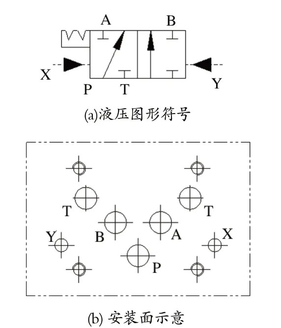 雙泵液壓站上使用的板式液動(dòng)換向閥安裝在閥組油路塊上,通過油路塊上設(shè)計(jì)的油孔及螺釘安裝孔進(jìn)行連接。圖2 所示為 23Y 型板式液動(dòng)換向閥,其安裝面上油口眾多。當(dāng)然,進(jìn)口廠家也有板式液動(dòng)換向閥可供選擇,但是其安裝面上同樣油口眾多。美國PARKER 的 D3DP26D2N 板式液動(dòng)換向閥如圖3 所示,該換向閥在雙泵液壓站上也有使用。A 口、B 口和 P 口為閥的工作油口,X 口和 Y 口為控制油口。安裝面上油口眾多,這給閥組油路塊的油孔設(shè)計(jì)增加了難度。此外,板式液動(dòng)換向閥還存在閥芯容易卡阻、彈簧使用壽命短等問題,這都是制動(dòng)系統(tǒng)運(yùn)行中存在的安全隱患。