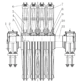 大部分天輪裝置為普通天輪結(jié)構(gòu),主要由軸承座、兩端軸承、天輪軸、游動(dòng)輪、固定輪、軸瓦、襯墊和卡箍等組成,如圖1所示。其中,左端輪子為固定輪,與天輪軸靠平鍵聯(lián)接;右側(cè) 3 個(gè)輪子為游動(dòng)輪,游動(dòng)輪與天輪軸之間有軸瓦,軸瓦與游動(dòng)輪轂之間靠高強(qiáng)度螺栓聯(lián)接;軸瓦內(nèi)部有儲(chǔ)油槽,通過潤(rùn)滑油脂來實(shí)現(xiàn)游動(dòng)輪與天輪軸靈活轉(zhuǎn)動(dòng)。當(dāng)每根鋼繩的線速度不完全相同時(shí),游動(dòng)輪與天輪軸之間可自由地相對(duì)轉(zhuǎn)動(dòng),防止鋼絲繩與襯墊之間產(chǎn)生滑動(dòng)摩擦,避免襯墊過度磨損,起到保護(hù)鋼絲繩的作用。zui 右側(cè)游動(dòng)輪的軸向定位通過安裝在天輪軸環(huán)形槽內(nèi)的兩半卡箍實(shí)現(xiàn),為了保證各游動(dòng)輪之間的間隙合適 (一般為0.2~0.5 mm),卡箍的厚度根據(jù)安裝實(shí)際情況進(jìn)行單配。該結(jié)構(gòu)的天輪裝置應(yīng)用較為廣泛,技術(shù)成熟。