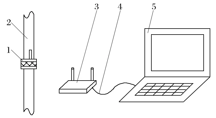 1.無(wú)線測(cè)量?jī)x;2.罐道鋼絲繩;3.無(wú)線接收模塊;4.通信電纜;5.電腦。