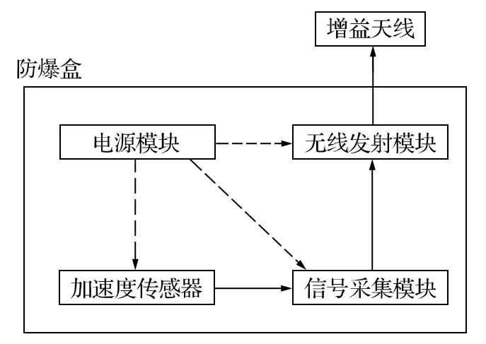 基于振動(dòng)波周期法研制的礦用罐道繩張力檢測(cè)裝置如圖3 所示。無(wú)線測(cè)量?jī)x的原理框圖如圖4 所示。無(wú)線測(cè)量?jī)x外部設(shè)有防爆外殼,將電源模塊、加速度傳感器、無(wú)線發(fā)射模塊、信號(hào)采集模塊等單元密封在內(nèi)。