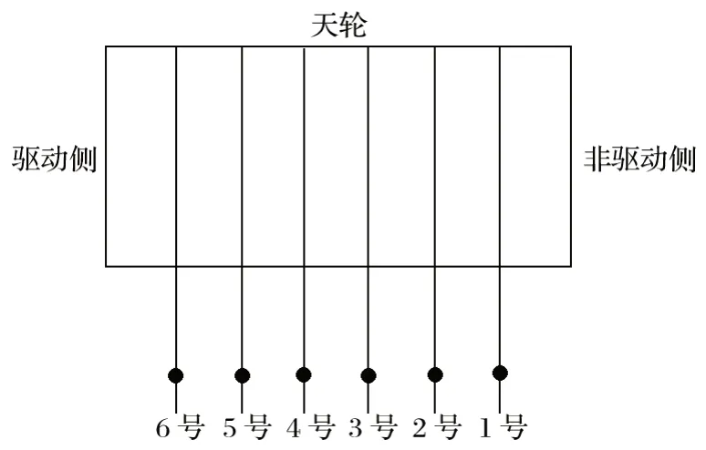 3 故障診斷分析3.1 鋼絲繩張力測試分析 鋼絲繩張力測試在 2 種工況下進行,分別是配重在井口時和配重在井底時。測試時,提升機要保持靜止狀態(tài),用小錘依次敲擊鋼絲繩,并用測振儀器記錄數(shù)據(jù)。從非驅(qū)動側(cè)到驅(qū)動側(cè)的鋼絲繩編號為 1~6,如圖 2 所示。鋼絲繩振動測試結(jié)果如表 1 所列。