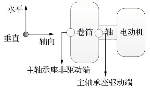 2.3 主軸承振動測試方案 在提升機正常運行下,利用測振儀器對電動機和滾筒的連接主軸承進行振動檢測,經(jīng)過儀器自帶的軟件進行頻譜分析后得到振動頻譜圖,再與軸承的故障頻率進行比對,從而判斷頻譜中是否存在軸承的故障頻率,進而確定主軸承是否存在故障。主軸承振動測試測點及方向如圖 1 所示。