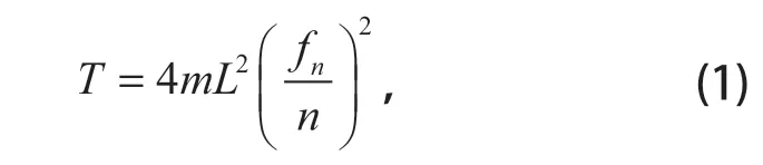 式中:m 為鋼絲繩單位長度質(zhì)量,kg/m;L 為鋼絲繩長度,m;n 為自振頻率的階數(shù);fn 為鋼絲繩第 n 階自振頻率,Hz。