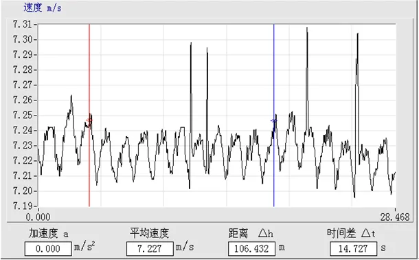提升機(jī)的運(yùn)行由電控系統(tǒng)控制,使用智能測(cè)試儀采集提升機(jī)配重上提時(shí)的速度曲線和電動(dòng)機(jī)電流曲線,如圖 3、4 所示。為了分析提升機(jī)zui大速度運(yùn)行時(shí)提升速度和電動(dòng)機(jī)電流的細(xì)節(jié)變化,通過(guò)處理得到局部放大圖,如圖 5、6 所示。
