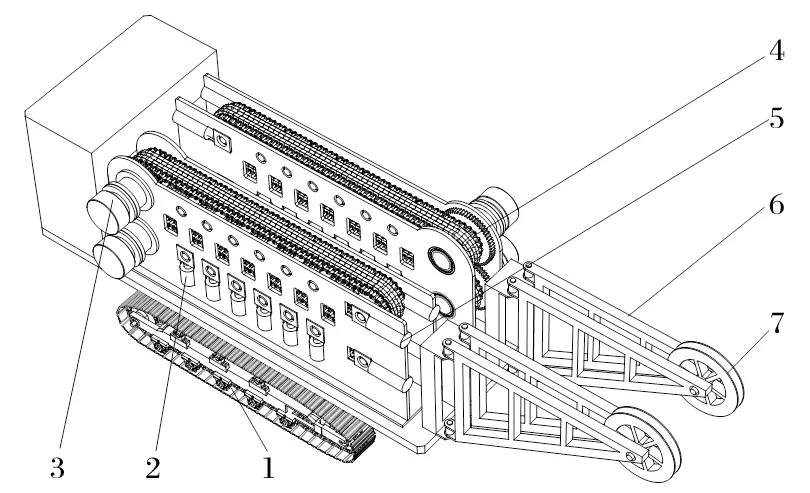 礦用提升機(jī)鋼絲繩換繩車的結(jié)構(gòu)如圖1所示,它主要由導(dǎo)向輪、整車機(jī)架、換繩機(jī)構(gòu)、液壓馬達(dá)、夾緊氣缸、張緊氣缸及履帶行走機(jī)構(gòu)組成。