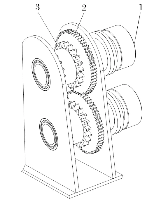 在現(xiàn)有研究的基礎(chǔ)上,本研究提出在連接兩鏈輪的軸上加一對(duì)同步齒輪。這樣不僅可以實(shí)現(xiàn)連續(xù)送繩,而且當(dāng)兩液壓馬達(dá)輸出的轉(zhuǎn)速不同步時(shí),可通過同步齒輪強(qiáng)制將兩軸轉(zhuǎn)速相同,從而實(shí)現(xiàn)兩鏈輪轉(zhuǎn)速同步,避免鋼絲繩打滑等問題。但這樣會(huì)導(dǎo)致同步齒輪受到較大的沖擊,如受到來自同步齒輪的相互擠壓,或液壓馬達(dá)輸出轉(zhuǎn)矩不穩(wěn)定時(shí)對(duì)齒輪的影響等,因此需要對(duì)同步齒輪進(jìn)行進(jìn)一步的分析。