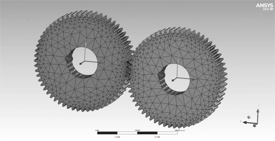 選用 ANSYS/Workbench 中的瞬態(tài)動力學(xué)模塊,對同步齒輪的嚙合過程繼續(xù)動態(tài)仿真分析。齒輪嚙合分析主要針對齒輪的接觸壓力以及zui大等效應(yīng)力特性。設(shè)置同步齒輪嚙合仿真時(shí)間為0.3s,選取28個(gè)齒面進(jìn)行14對接觸,接觸類型為摩擦接觸,摩擦因數(shù)為0.2,法向剛度系數(shù)為1。根據(jù)同步齒輪的運(yùn)動特性,確保齒輪只能繞 z 軸轉(zhuǎn)動。齒輪瞬態(tài)分析約束與載荷施加情況如圖8所示。